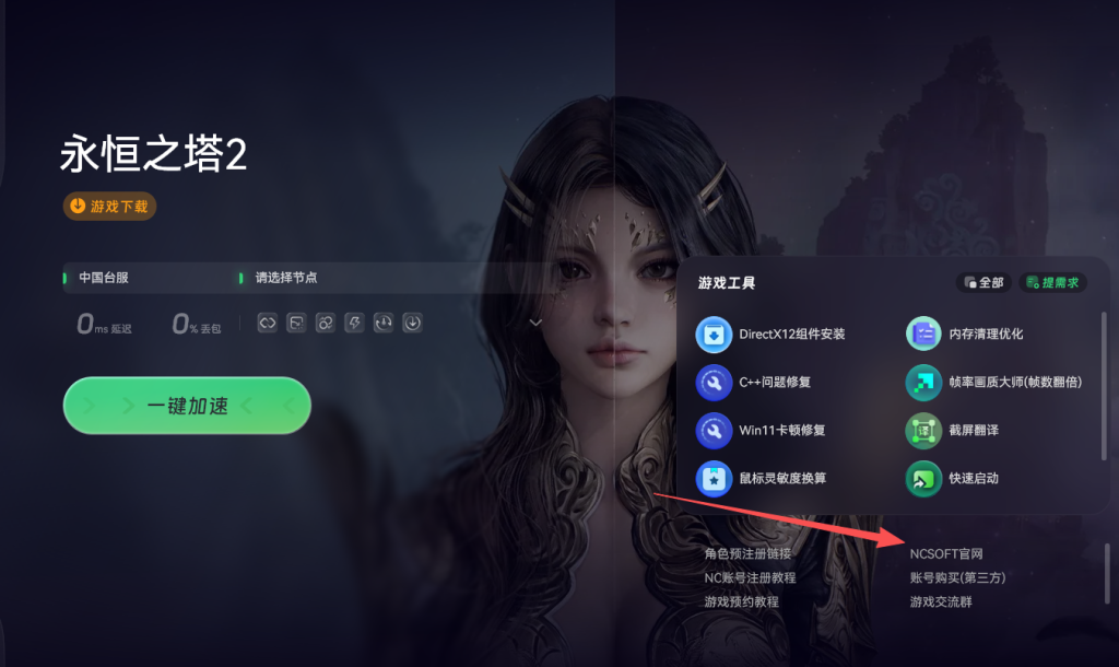完成加速操作后,在奇游加速页面的右侧,能看到一个游戏官网地址按钮,点击它,就能顺利访问永恒之塔2的官方网站。