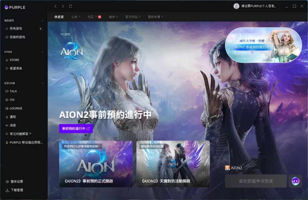 登录成功后便会进入到紫p的登录器页面。在这里可以看到AION2的游戏介绍。等到官方开放预下载时,玩家就可以直接在这个页面下载游戏了。