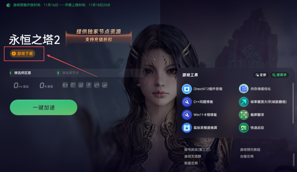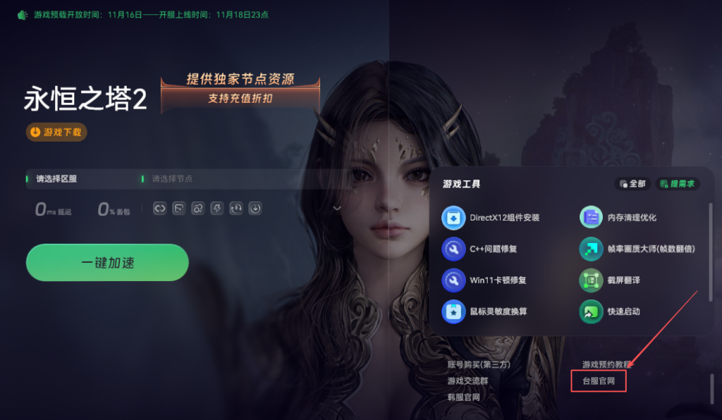 第一步是进游戏官网。注意,访问台服官网是需要开加速器的。这里推荐用奇游加速工具,搜索“永恒之塔二”,然后选个台服的节点进行加速。