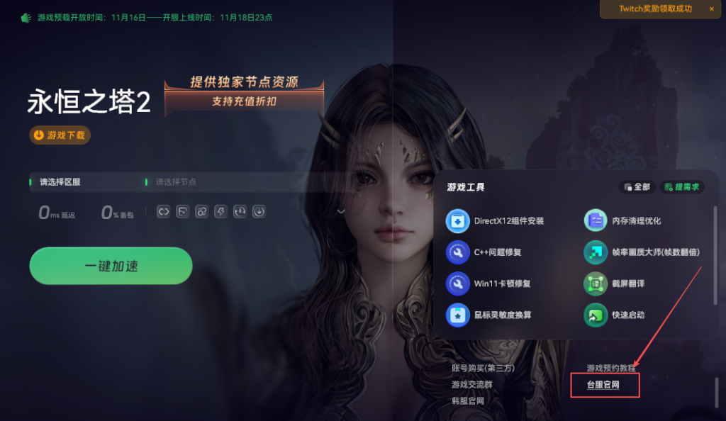 这里以奇游加速工具为例,先下载安装好软件。打开奇游之后,在搜索“永恒之塔二”,记得要选择台服节点进行加速,别选错了。