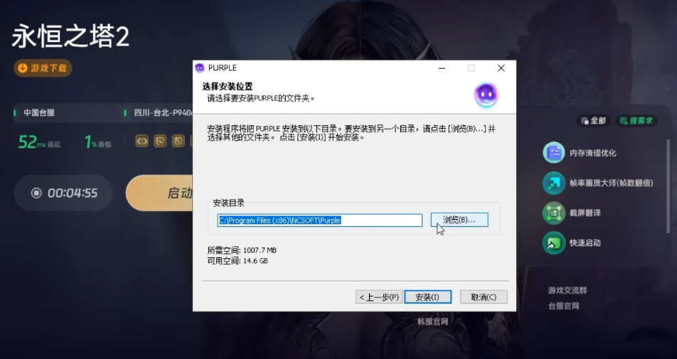 装好后打开Purple,一定要记得在登录前把地区改为“台服”,否则会报错。