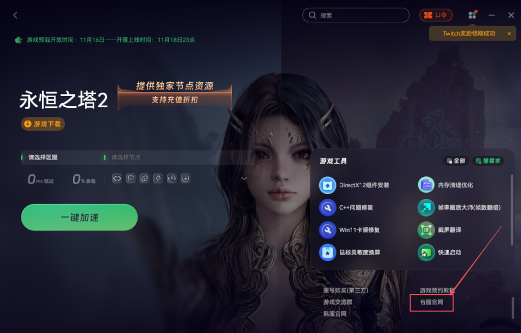 先打开台服官网。如果直接访问不顺利,打开奇游加速工具,搜索“永恒之塔二”并选择台服加速,点加速页里的官网链接就能直达。