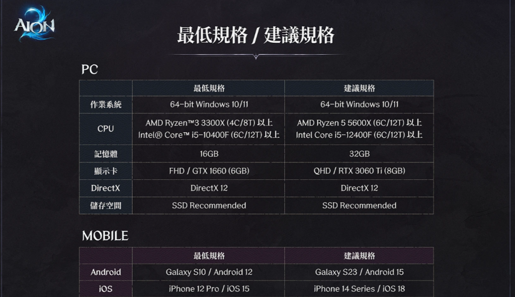首先来看看电脑端的配置需求,对于CPU游戏要求至少达到i5-10400F或更高性能;内存方面,16GB是基本门槛;显卡方面GTX1660显卡就能确保在1080p分辨率下流畅运行。相较于当前市场上主流的MMORPG游戏永恒之塔2的配置要求可以说是相当亲民了。