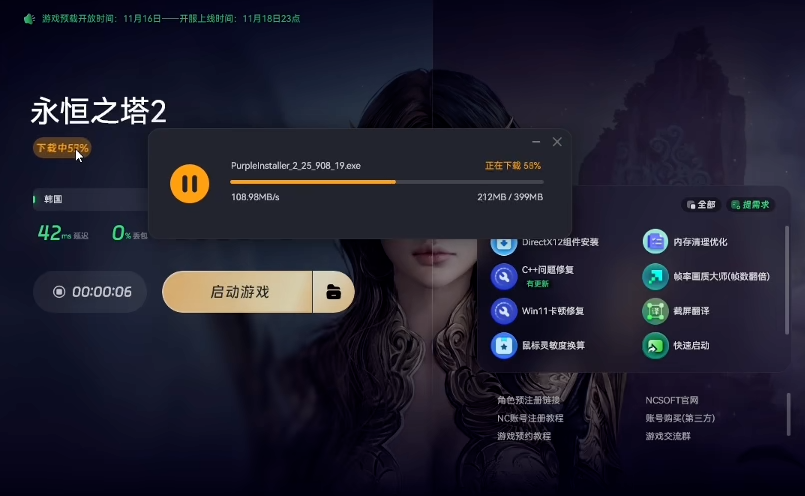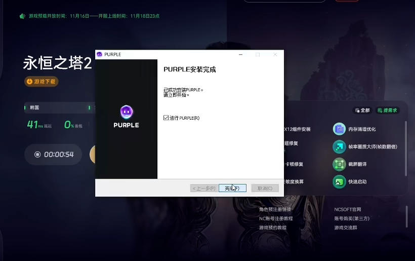 登录成功进行预约安装。等到16号时打开purple平台就会自动帮你下载永恒之塔2。