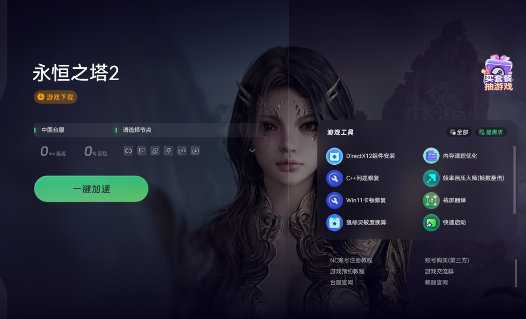 首先需要准备一个奇游加速工具。打开奇游后在搜索栏输入永恒之塔2,然后点击一键加速,为后续操作提供稳定的网络环境。