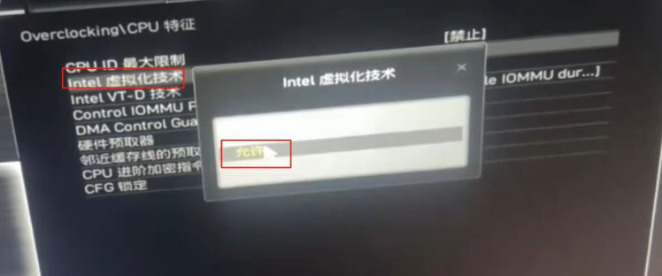 进入BIOS后,按F7进入高级模式,选择“OC”选项,往下找到“CPU特征”菜单,进入后开启“INTEL虚拟化技术”,最后保存设置并退出。