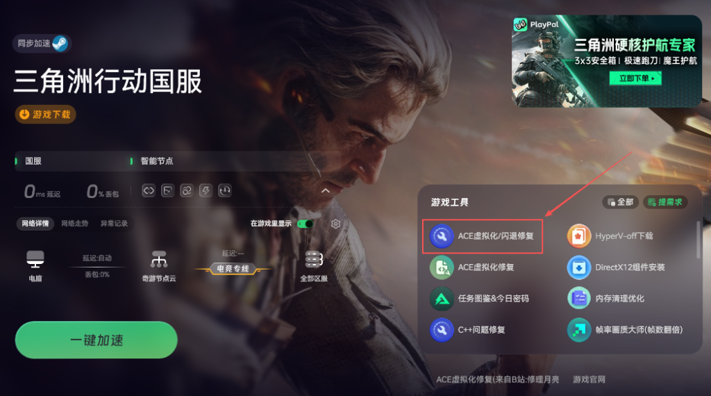 加速成功后,在加速页面的右侧找到“ACE虚拟化闪退修复”功能,点击进入后按照提示依次点击“下一步”,然后选择“一键修复”。