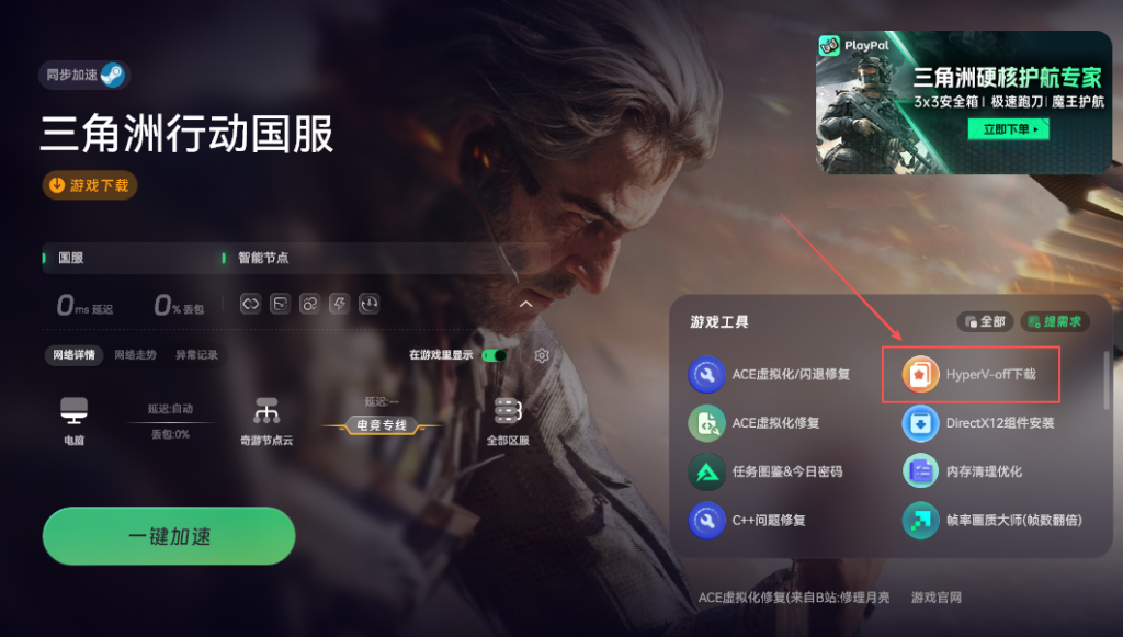 如果完成以上设置后游戏仍然报错,可以回到奇游加速页面,找到“hyperf off”工具并下载。