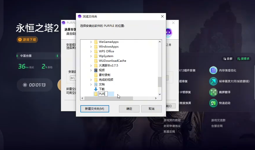 首先打开奇游加速工具,点击一键加速功能。加速完成后,在加速工具界面上方找到游戏下载按钮并点击。此次下载的是purple客户端,为保证系统运行流畅,建议不要将其安装在C盘,可选择其他空间充足的磁盘进行安装。