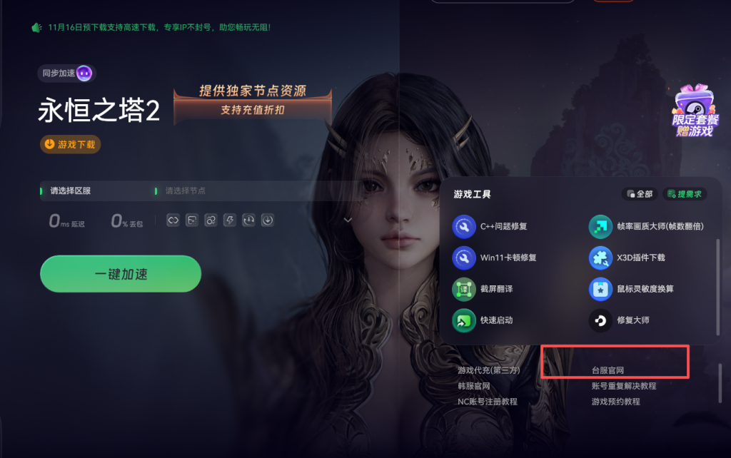 由于需要前往台服官网进行账号注册,所以加速器必不可少。这里小编推荐使用奇游加速工具。打开奇游搜索永恒之塔2,选择台服进行加速。加速成功后,点击右下角的台服官网链接,跳转到注册页面。