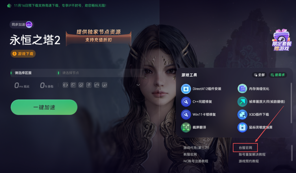 首先你需要一个加速工具来顺利下载游戏,比如打开奇游,搜索“永恒之塔2”并选择台服节点,这样能避免因为地区限制导致的网络问题。