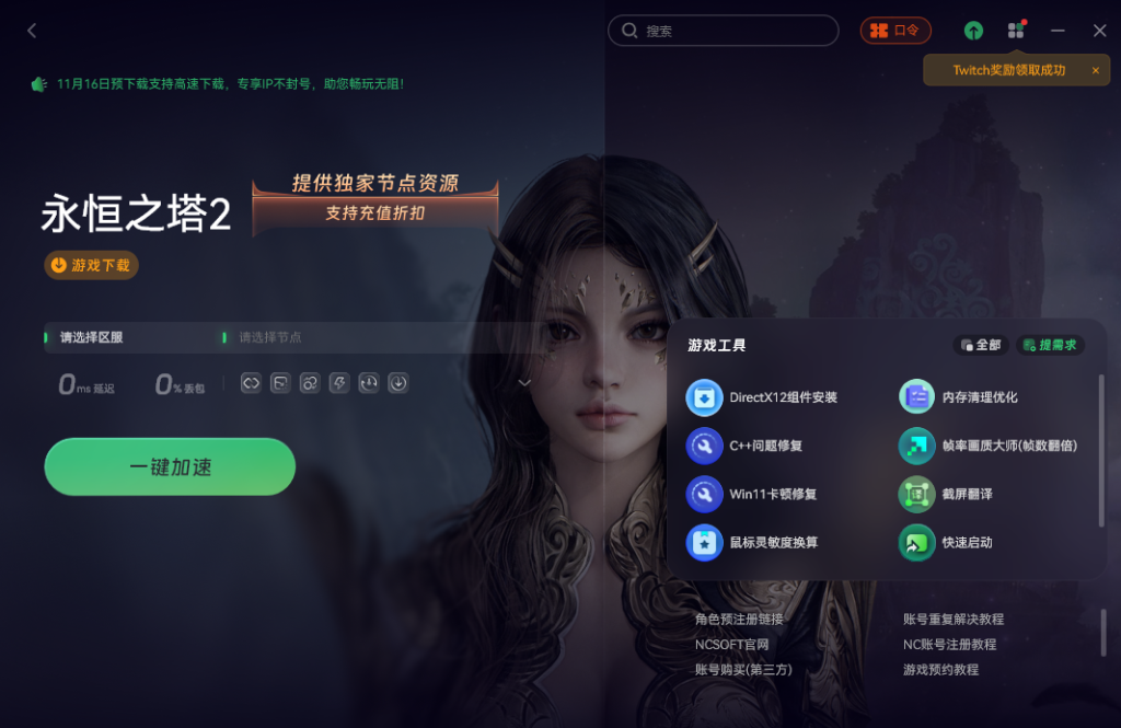 首先,无论是台服还是韩服,都需要用到“ncsoft”这个平台的账号来登录。第一步是解决网络问题,建议先用奇游加速工具。打开软件后直接搜索“永恒之塔二”,然后选择一个台服的节点进行加速,这样网络会更稳定。