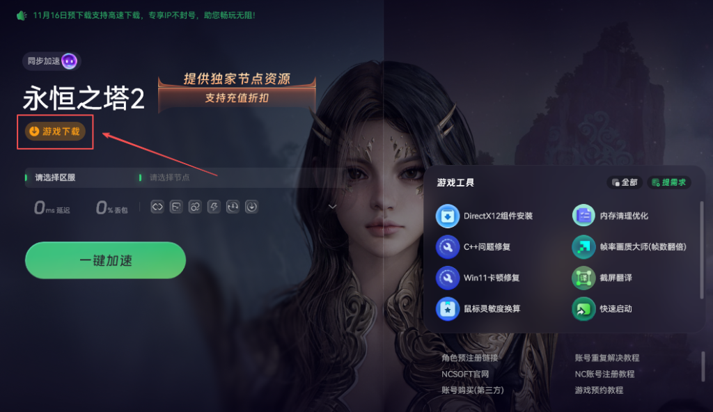 使用注册账号登录启动器,即可看到《永恒之塔 2》游戏入口。该游戏 11 月 18 日正式开服,11 月 16 日开放预下载与角色预创建,启动器将同步推送通知,届时点击 “开始安装” 即可完成客户端下载,等待开服即可体验。