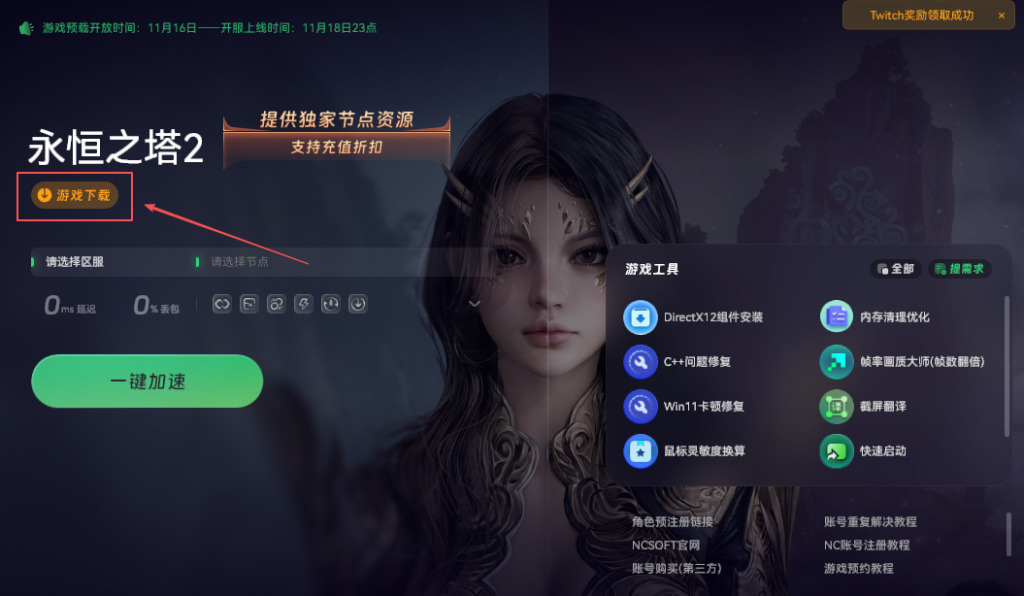 用注册好的账号登录启动器,在游戏库中找到《永恒之塔 2》,点击进入后可提前预约下载。待官方开放下载权限后,启动器会自动推送通知,届时点击 “开始安装”,即可完成游戏客户端自动下载,等待开服后便能体验游戏的多元玩法。