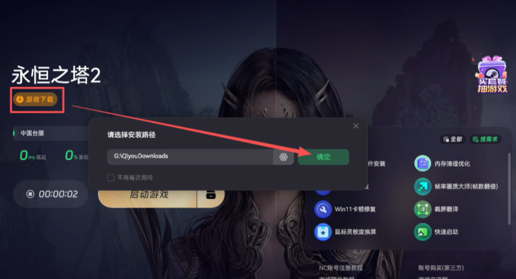 加速成功后,在奇游加速页面找到游戏下载选项,点击一键下载永恒之塔2的客户端。下载完成后,按照提示进行客户端的安装。