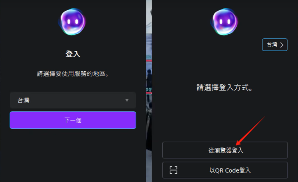 安装好客户端后,打开软件,在地区选择界面选择台服地区。之后从浏览器登录客户端,输入提前准备好的账号密码,就能成功登录。