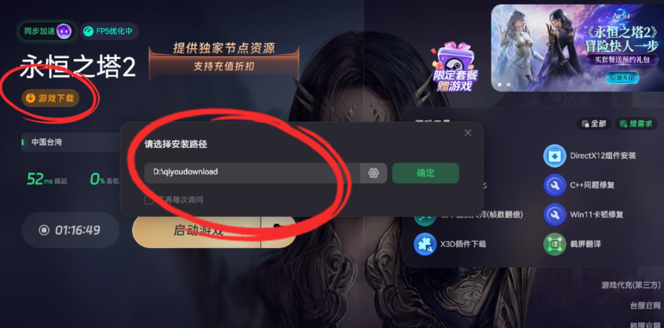 完成以上操作后,即可在 NC 平台中启动《永恒之塔 2》的下载,安装完成后便可正常运行游戏。