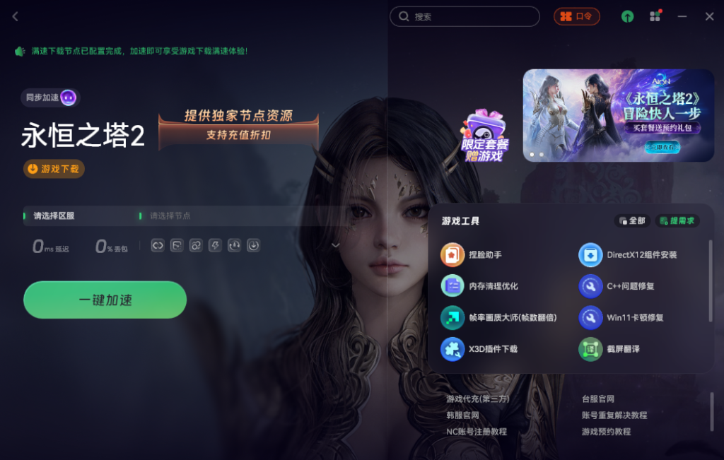 首先要解决网络适配问题,国内网络无法直接访问外服资源,推荐使用奇游加速工具。打开工具后搜索 “永恒之塔 2”,选择对应加速节点启动,可有效改善本地网络环境,解决下载卡顿、下载失败、无法下载以及 PURPLE 登录报错等常见问题,为后续操作提供稳定网络保障。