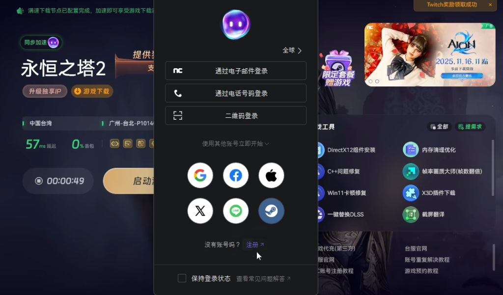 首先玩家们先使用奇游加速工具来优化网络环境。打开奇游加速工具后搜索框永恒之塔2,点击加速选项,为后续的下载与注册流程提供稳定的网络支持。