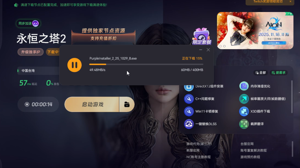 在准备下载游戏前,有些用户可能会遇到在Purple平台找不到永恒之塔2,或者点击游戏后自动跳转到网页的情况。这大概率是因为当前登录的账号并非台服或韩服账号。解决这一问题并不复杂,只需先打开奇游加速工具在搜索栏输入永恒之塔2,选择台服节点进行加速操作。