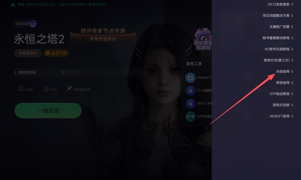 使用加速器时,先打开奇游搜索永恒之塔2,选择台服节点并启动加速。加速成功后,加速器界面会展示官网链接,直接点击即可进入。
