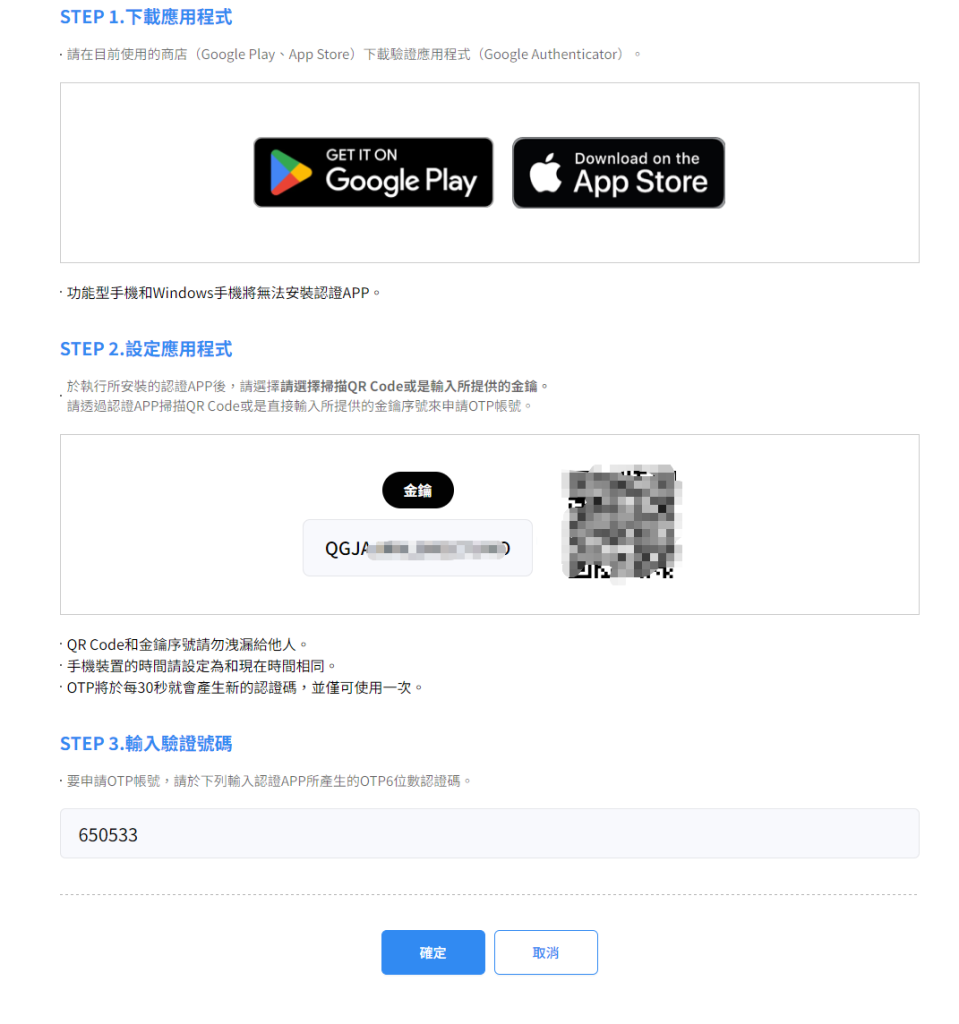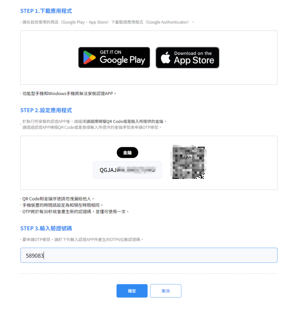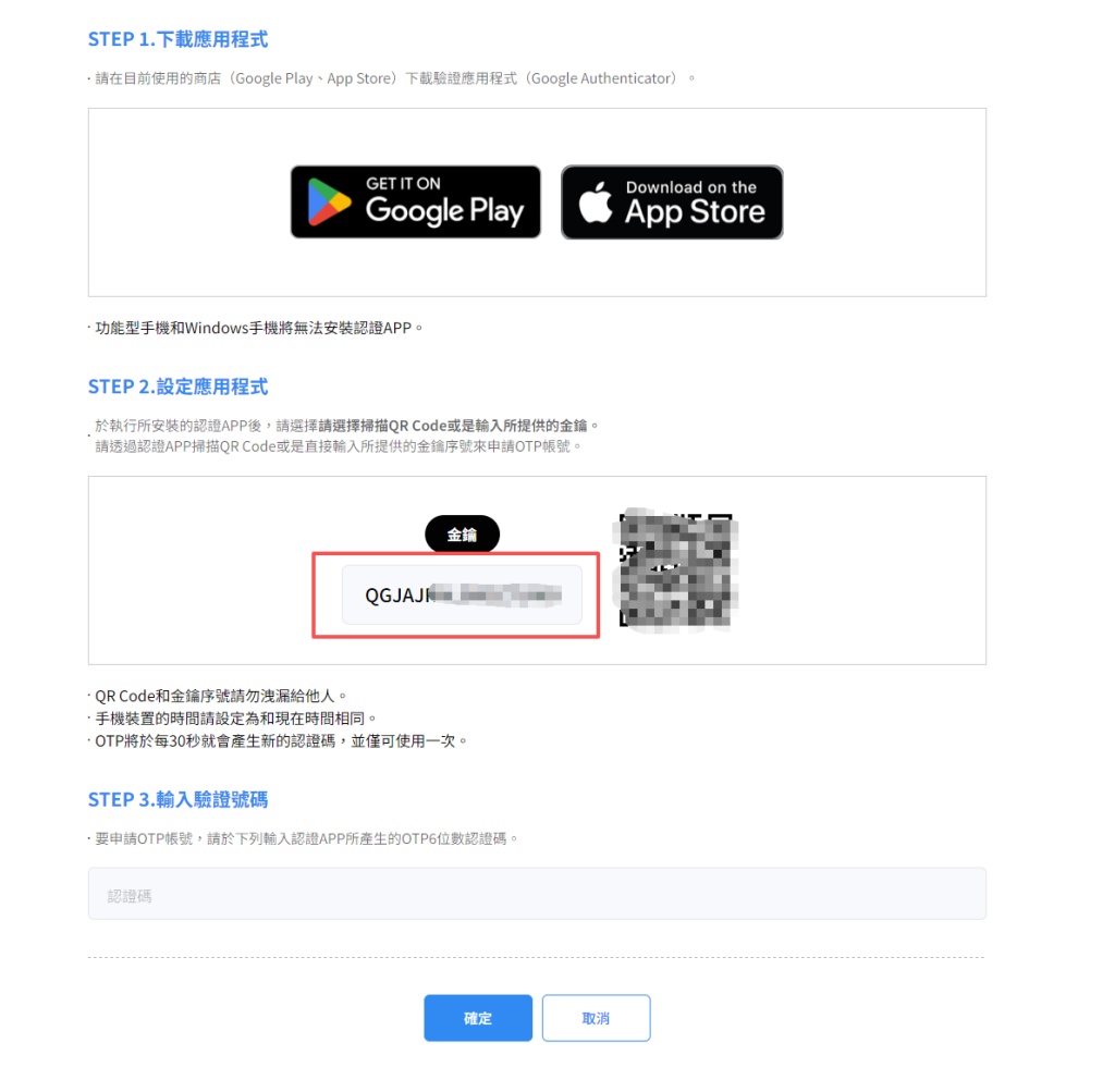 之后再完成一次OTP验证,就弄好了,记得保存这这串代码