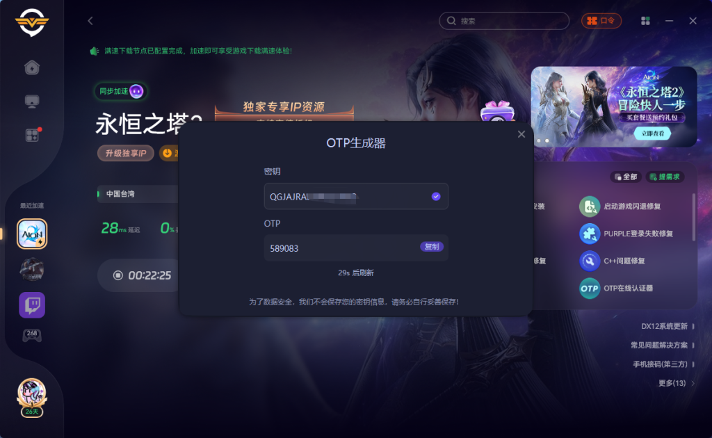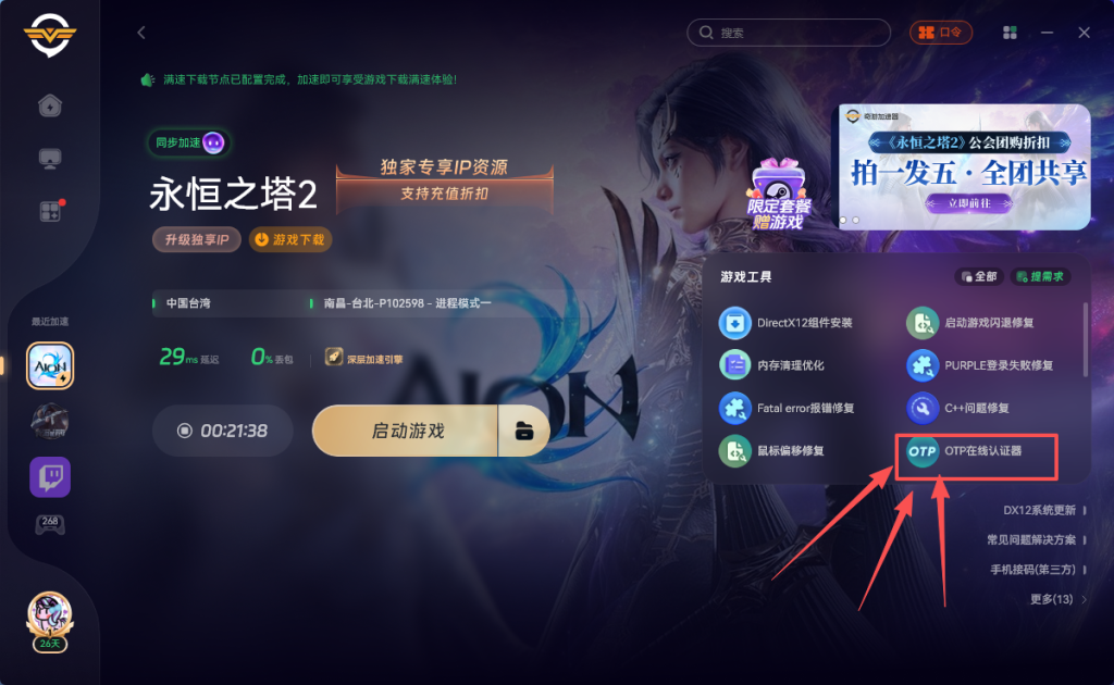 然后我们打开奇游加速《永恒之塔2》点击右侧的OTP在线认证器