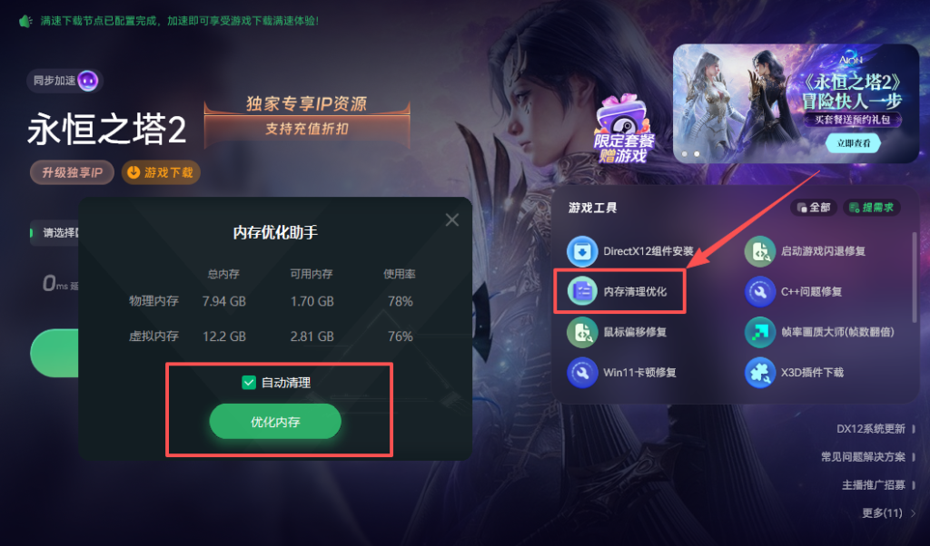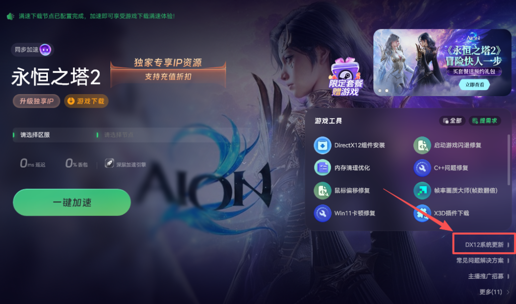 在打开《永恒之塔2》过程中,打开奇游,搜索”永恒之塔2″。优化电脑本地网络的环境,从而解决因网络问题导致的卡加载、一直转圈、登录失败、Dx12报错、Fatal error等情况,顺利解决问题。