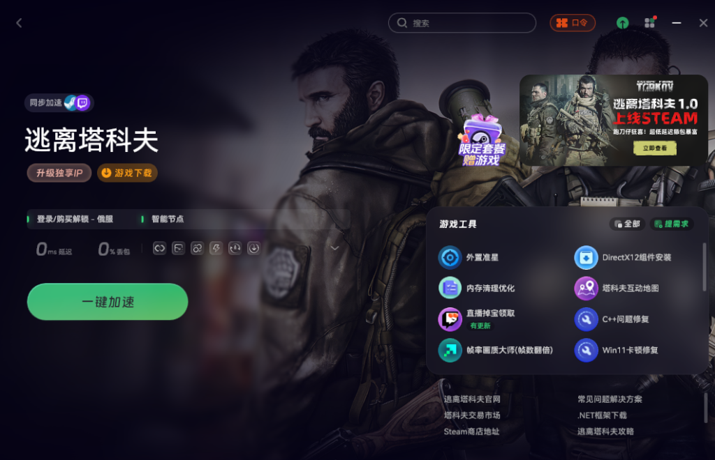 在打开《逃离塔科夫》过程中,打开奇游,搜索”逃离塔科夫”。优化电脑本地网络的环境,从而解决因网络问题导致的游戏进不去、文件损坏或需要用户操作等情况,顺利解决问题。