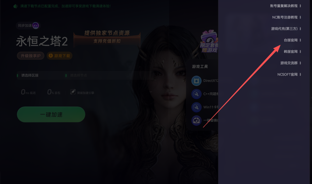 加速设置完成后,在奇游加速页面右侧,能看到一个游戏官网地址按钮,点击就能访问永恒之塔2的官方网站。
