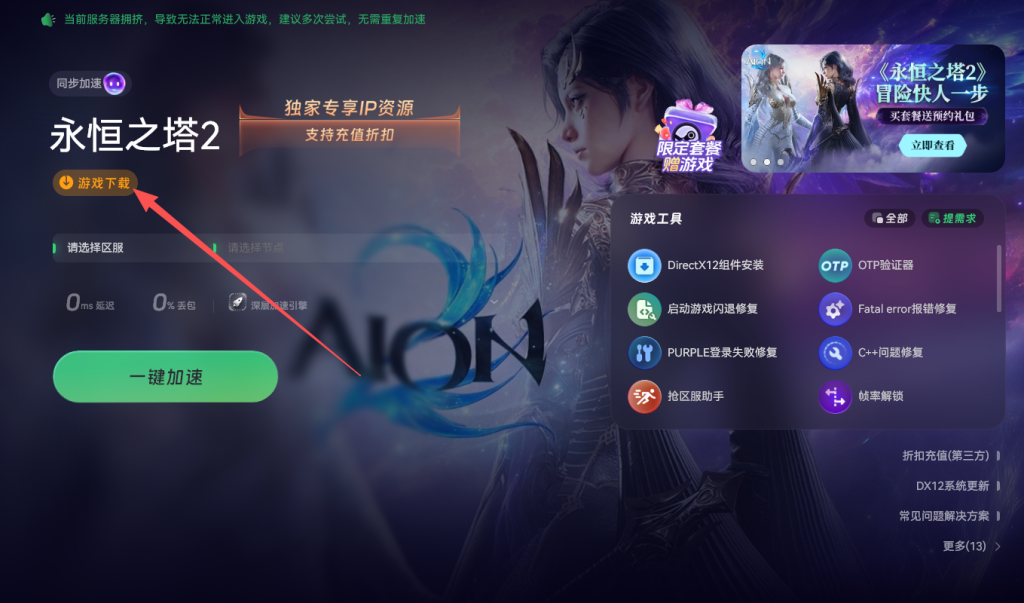 在开启永恒之塔2的魔幻冒险之前,做好充分的准备工作十分关键。玩家需要提前下载并安装好奇游加速工具,这是确保后续下载和游玩过程网络畅通的基础。打开奇游加速工具搜索永恒之塔2,随后选择台服节点,开启网络加速功能。