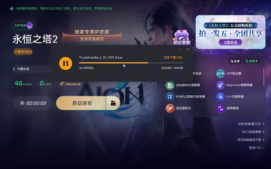 在成功开启加速后,玩家会在加速页面看到游戏下载按钮,直接点击按钮,开始下载永恒之塔2的客户端。