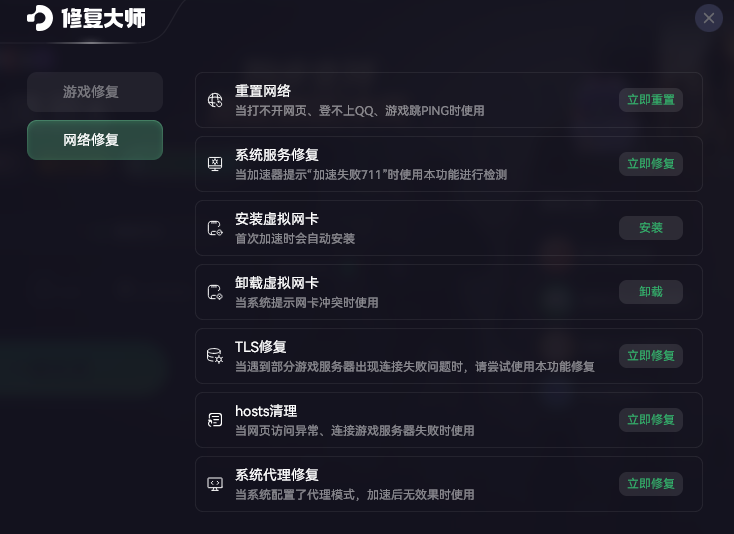 除了为核心游戏提供网络加速这一主要功能外,奇游还内置了强大的网络工具箱,为玩家提供一站式的网络问题解决方案。工具箱内集成了诸如网络修复、Hosts清理、FPS优化等实用工具。
