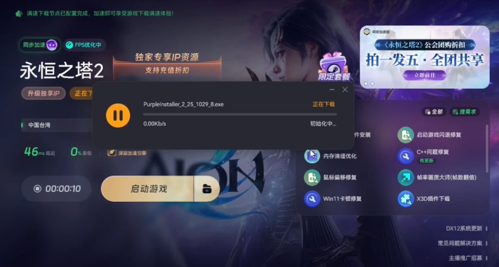 在奇游加速器界面点击“游戏下载”按钮,系统会自动下载并安装Purple平台。