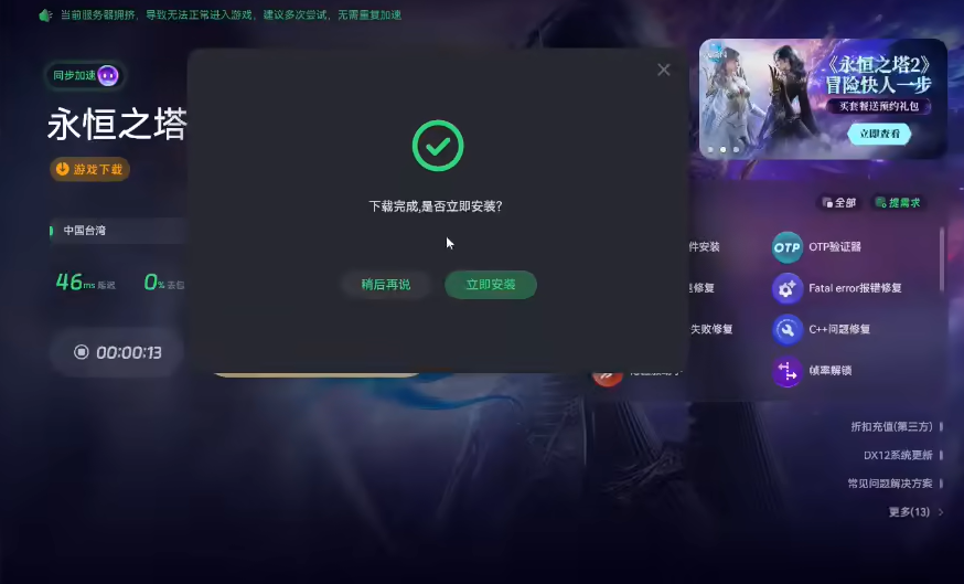 首先需下载并安装奇游网络加速工具,在搜索栏输入永恒之塔2后,选择台湾服务器节点进行网络优化。点击一键加速按钮后,系统将自动建立专用加速通道,此时界面会显示实时网络延迟数据。