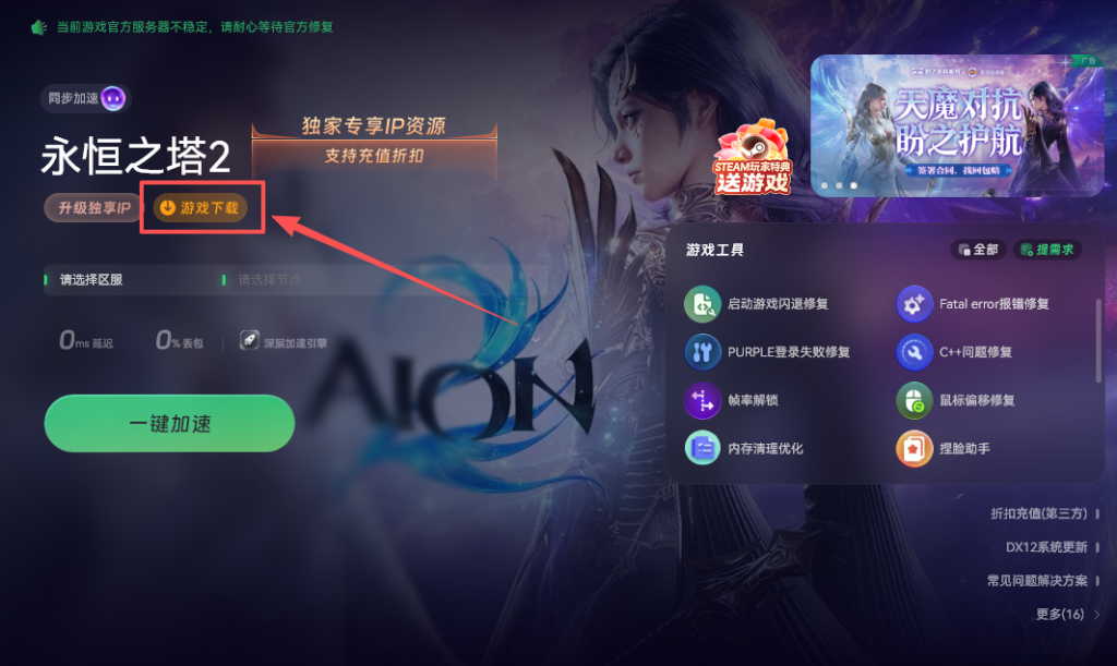 《永恒之塔 2》正式开放服务器,众多玩家已准备踏入亚特雷亚大陆开启冒险。由于游戏服务器集中在台服、韩服,国内玩家直连易出现下载缓慢、卡顿或掉线等问题,提前备好加速工具并掌握注册下载流程,能避免开服初期走弯路。以下是超详细的图文步骤指引。