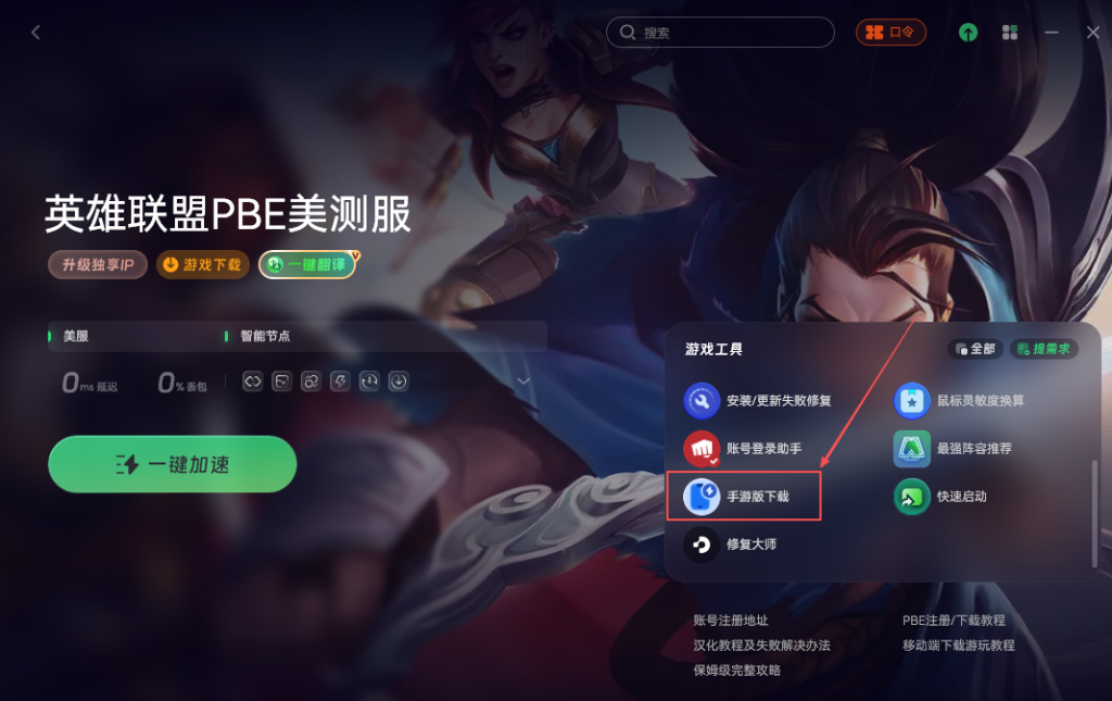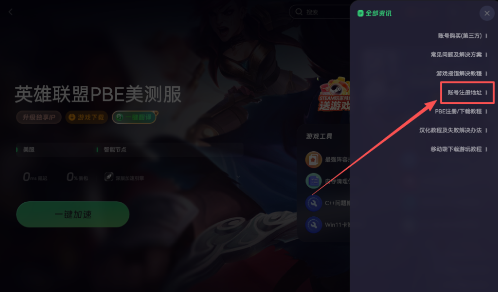 加速成功后,页面右侧一般会提供PBE美测服的注册入口,点进去就能开始注册账号。