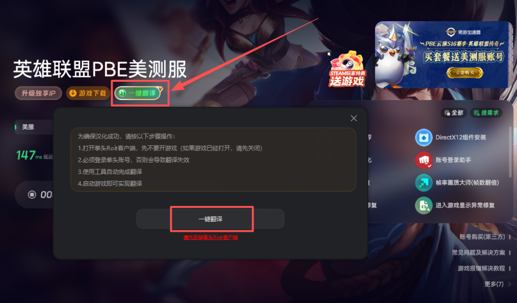 装好之后,打开拳头平台,登录刚才注册的账号,在游戏列表里找到英雄联盟PBE版,点安装前记得把语言调成你习惯的选项。