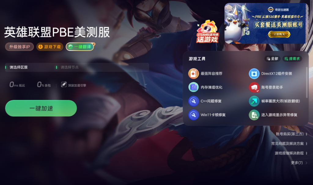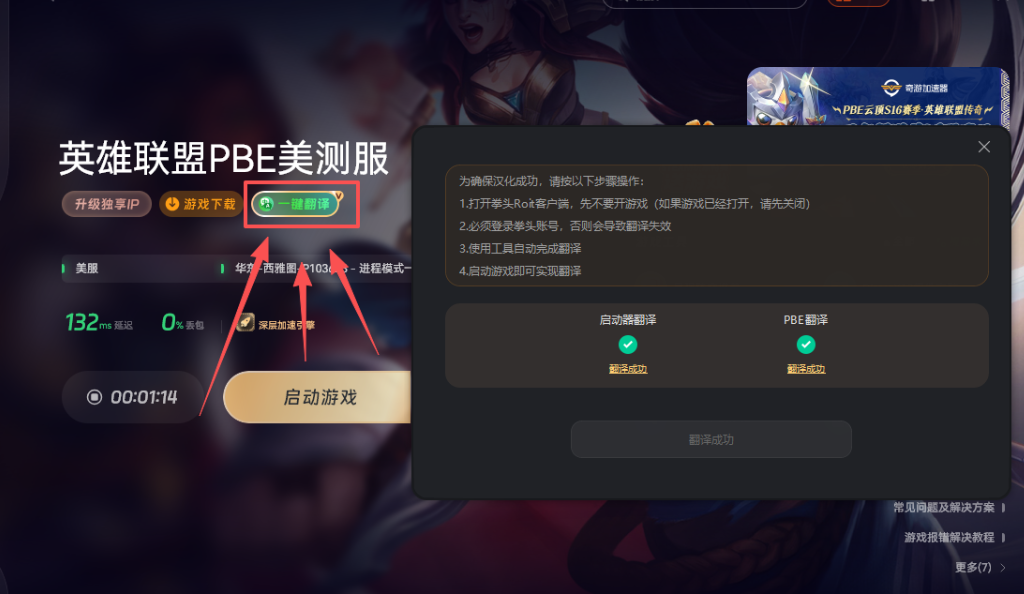 PBE的汉化操作十分简单。在奇游加速工具保持加速的状态下,打开拳头客户端,在客户端右侧找到游戏翻译选项,点击它就能完成一键汉化。