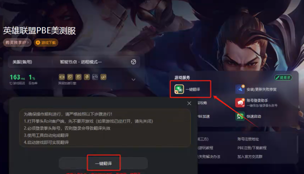 安装好客户端后,打开客户端,输入刚刚领取到的测试服账号,开始下载游戏。PBE的汉化操作也十分简便,在奇游加速状态下,打开拳头客户端,点击右侧的游戏翻译选项,就能完成一键汉化。