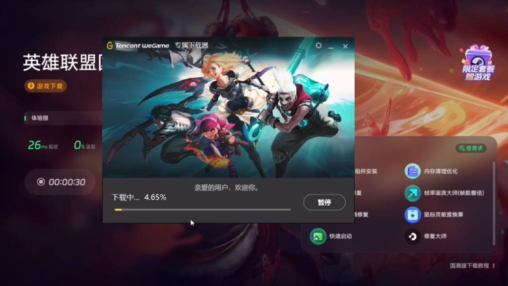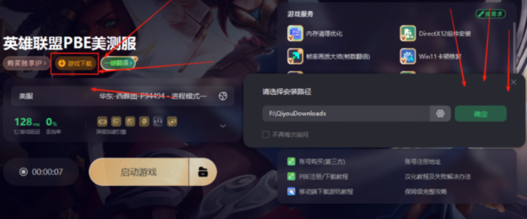 加速成功后,在加速工具界面右侧点击游戏下载按钮,开始下载联盟国测服客户端。下载完成后,按照提示进行安装,安装完成后就能进入游戏,感受国测服的独特玩法了。