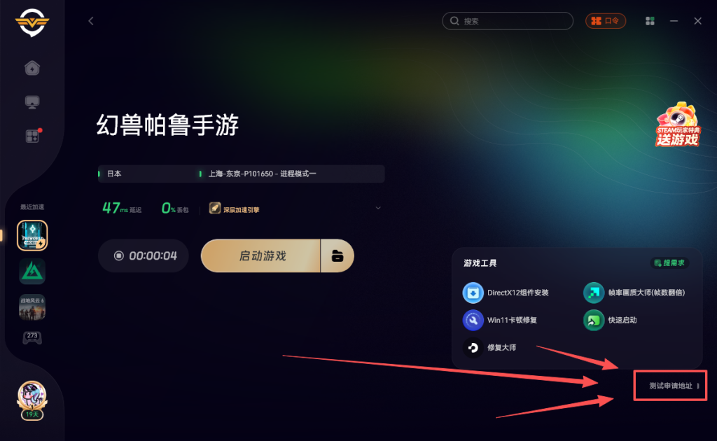 我们可以使用奇游加速《幻兽帕鲁手游》点击右侧的测试申请地址即可正常进入