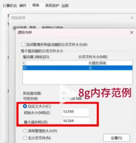 先把C盘设为“无分页文件”,然后在游戏安装的盘符下,选择“自定义大小”来手动设置。比如说你电脑内存是8G,初始值可以填“8192”(8×1024),最大值填“12288”(8×1024×1.5)。设好之后点确定,重启一下电脑。