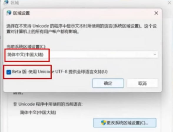 把这里改成“中文(简体,中国)”,并且勾选上“Beta版: 使用Unicode UTF-8提供全球语言支持”,然后确定重启。