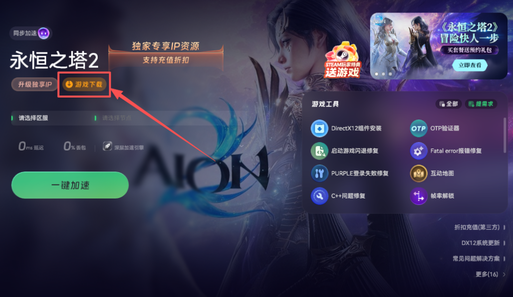 加速开启之后,在加速页面里一般会有一个明显的【游戏下载】按钮,点这里就能获取到官方安装包。