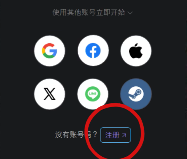 安装好purple平台后,就进入账号注册环节。如果没有苹果账号或者steam账号,不用担心,可以直接点击平台界面下方的注册按钮来创建新账号。