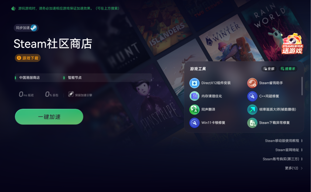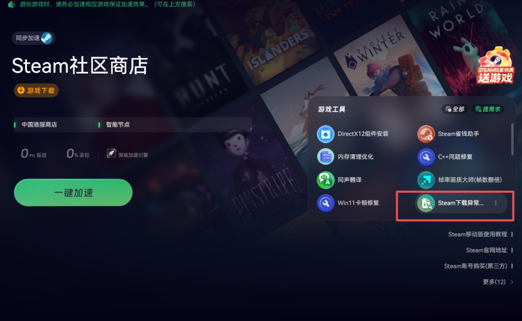奇游还提供了Steam下载异常修复功能。能够智能检测并修复下载链路中的异常问题,如网络配置错误、DNS解析失败等,从而帮助玩家快速恢复正常的下载速度。