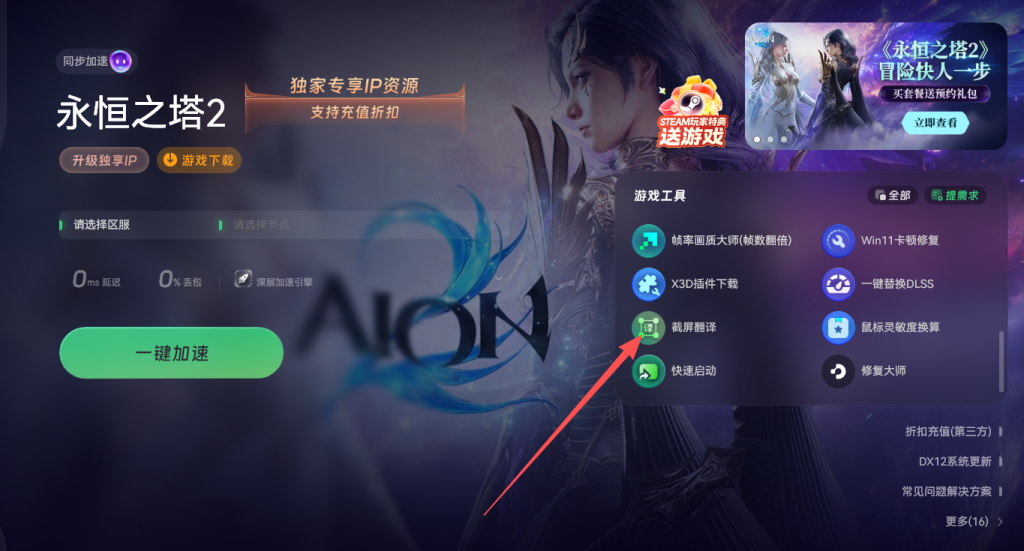 首先玩家们要准备好奇游加速工具。打开奇游加速工具后,在搜索栏输入永恒之塔2,对其进行加速操作。