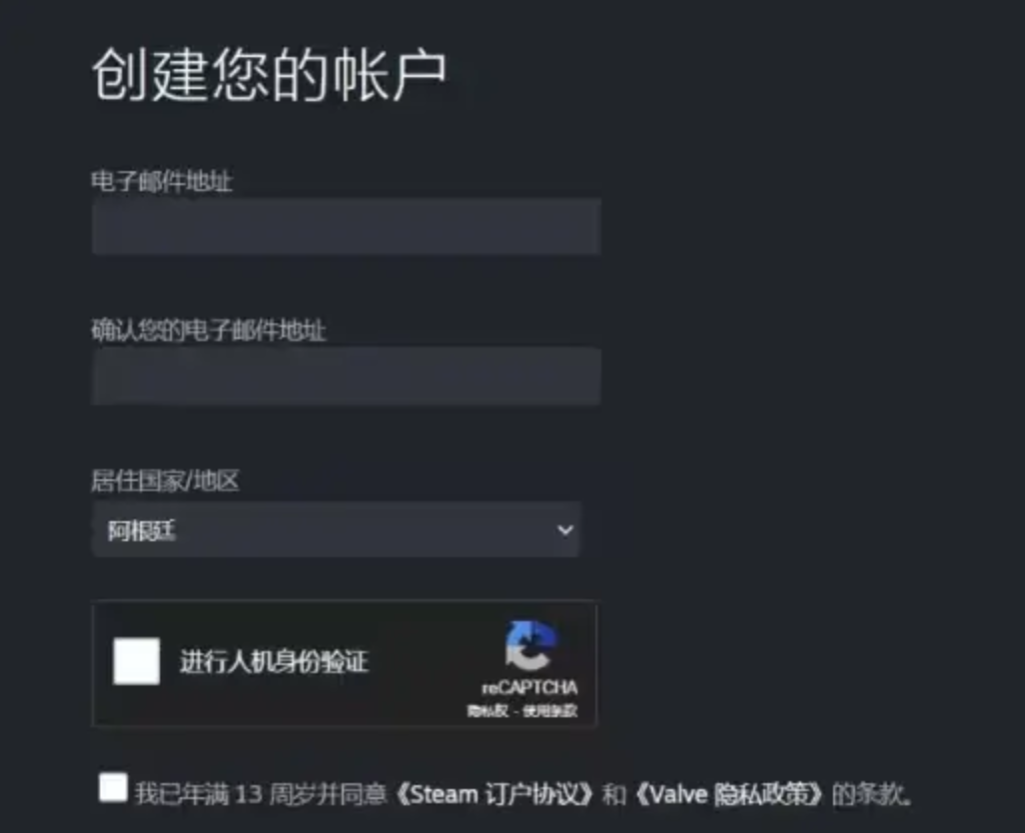 打开 Steam 客户端,在登录界面点击创建免费账户。接着填写你常用的电子邮箱地址用于注册。之后根据自己的实际情况选择注册的国家和地区。完成人机身份验证,按照要求完成图片验证,以此证明你不是机器人。勾选我已满 13 周岁并同意协议,然后点击继续。