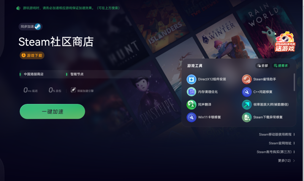 因为 Steam 是海外游戏平台,为了能在注册和下载过程中拥有更好的网络体验,提升下载速度,建议大家先使用奇游加速工具。在奇游加速工具中搜索Steam并开启加速,这样能有效解决可能出现的网络问题。